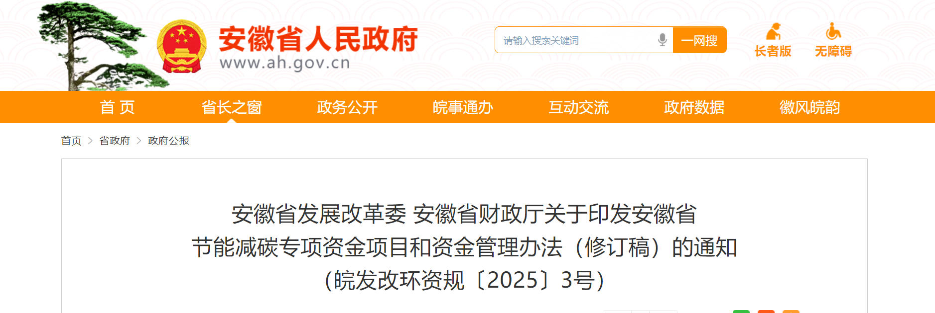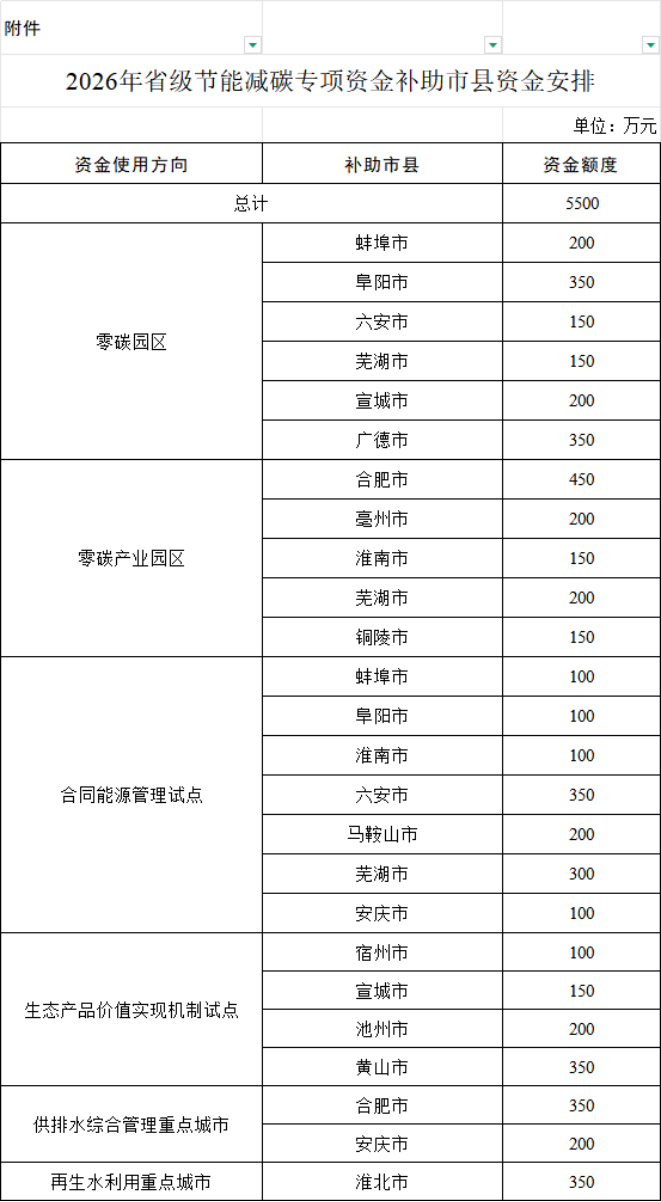 補助超五千萬!安徽2026年省級節能減碳專項資金補助市縣資金安排公示