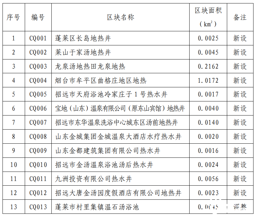 規劃期內,共設置地熱勘查區塊2處,分別為山東省棲霞市惠禾·艾山地區地熱普查和山東省棲霞市長春湖·霞光地區地熱普查,投放時間為2022年。規劃地熱重點開采區1處,位于招遠市東湯地熱田。重點開采區內要嚴格按照開采規劃區塊優先投放采礦權,鼓勵支持礦山企業整合重組,優化開發布局,提高資源利用效率。