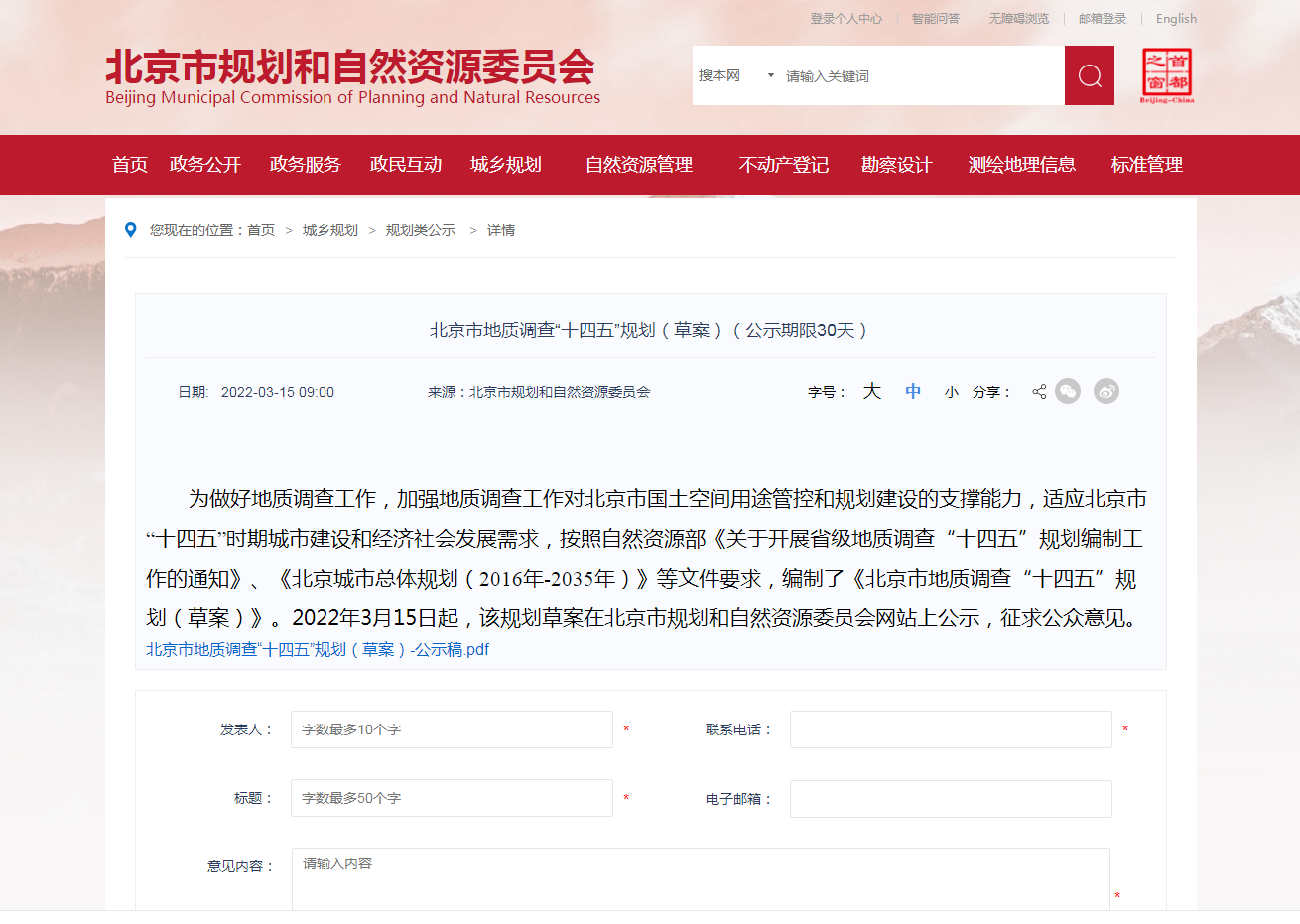 地大熱能地熱+多能互補網訊:《北京市地質調查“十四五”規劃(2021—2025年)(草案)》(以下簡稱《草案》)3月15日起在市規劃自然資源委網站公示,聽取公眾意見,公示期30天。《規劃》提出,北京市將率先對首都功能核心區地熱能等開展綜合地質調查評價,提供地質安全保障。社會公眾對該《規劃》如有意見建議,可在4月14日前登錄北京規劃自然資源委網站留言。