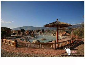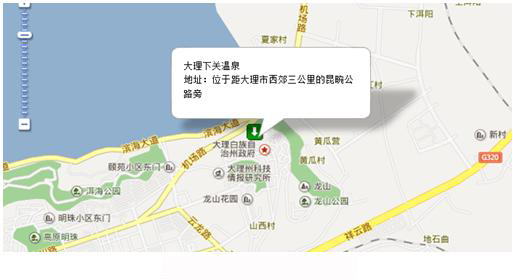 下關(guān)溫泉,位于距大理市(下關(guān))西3公里的西洱河峽谷中,在昆畹公路即320國(guó)道旁,原名大理“德勝關(guān)”,又名塘子鋪,現(xiàn)附近的村子叫青菜莊。據(jù)《趙州志》記載:“德勝鋪,北通太和縣(今大理古城),有德勝關(guān)市。”由此可知原為大理西通保山的關(guān)隘要塞,后為集市,又因有大理溫泉而得名。大理下關(guān)溫泉泉水從石罅中涌出,大理下關(guān)溫泉流量每天為200噸,水溫為76℃,含有碳酸鹽等十多種礦物質(zhì),水質(zhì)優(yōu)良,浴后皮膚滑潤(rùn),對(duì)皮膚病、風(fēng)濕病等有一定的療效。